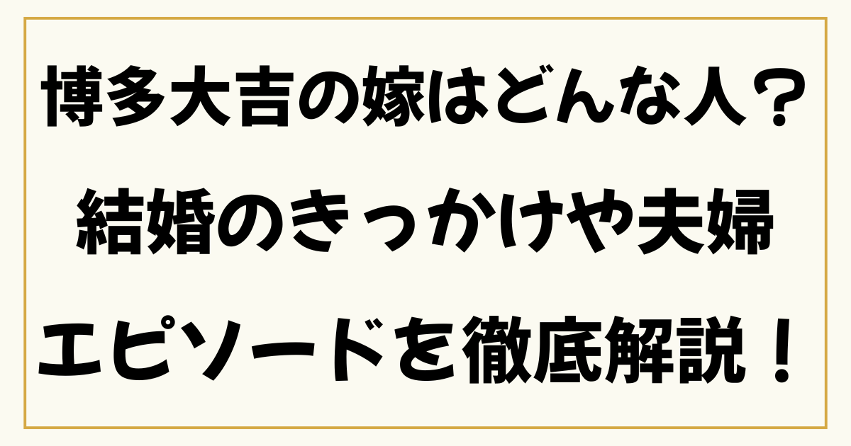 そんな博多大吉さんの奥さまはどんな人なのか、結婚のきっかけや夫婦仲のエピソードについて、気になる人も多いのではないでしょうか?